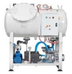 Las bombas de vacío del sistema están conectadas al depósito de recogida y después a la red de tuberías, lo que garantiza un nivel constante de vacío en todo el sistema. El funcionamiento de las bombas se regula con un sistema de medición electrónico. El depósito de recogida, equipado con control de nivel, recibe el agua condensada de la red de tuberías a través de dos conexiones de entrada. Cuando es necesario, las bombas de vacío se detienen y se activa la bomba de descarga, vaciando el depósito en la red de alcantarillado. Todo el sistema se gestiona mediante el panel de control del PLC.